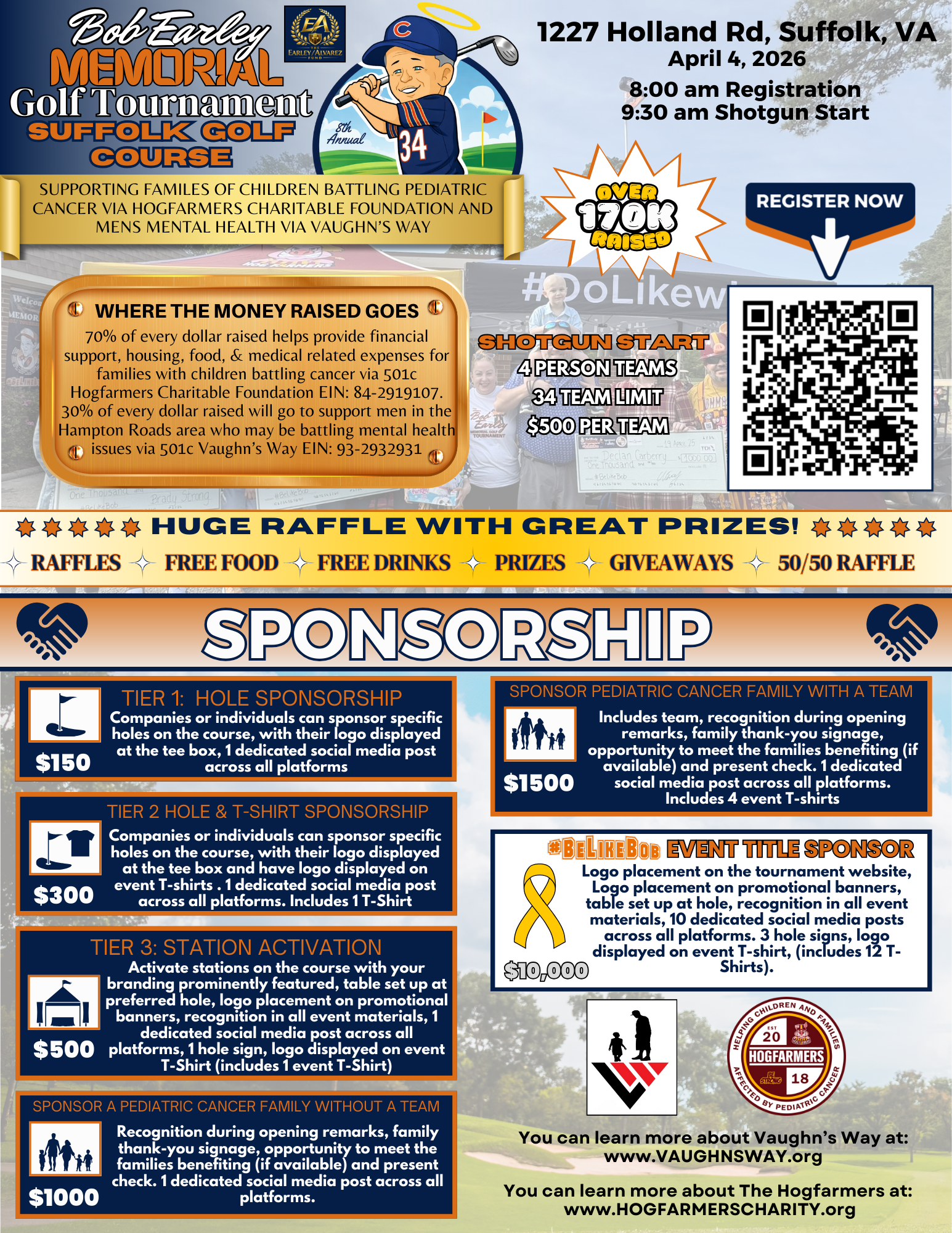 For as little as $5, you can be part of something big. Every penny of your donation will go directly to covering the overhead of the tournament, meaning more money will go straight to supporting the incredible work of the Hogfarmers Charitable Foundation and Vaughn’s Way Inc.